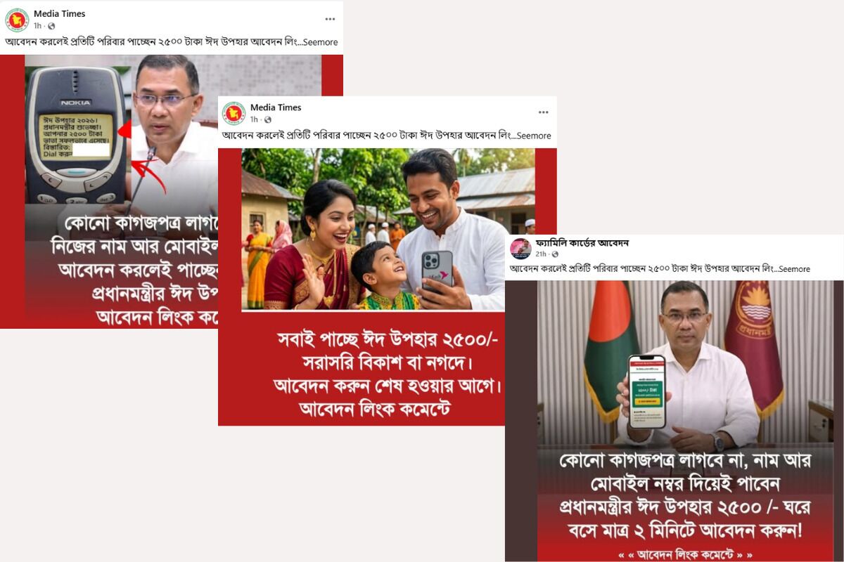 ১১ মার্চ করা একটি ফটোকার্ড পোস্টের ক্যাপশনে লেখা ছিল, “সকলেই পাবেন প্রধানমন্ত্রীর ঈদ উপহার ২৫০০/- আবেদন করলেই।”