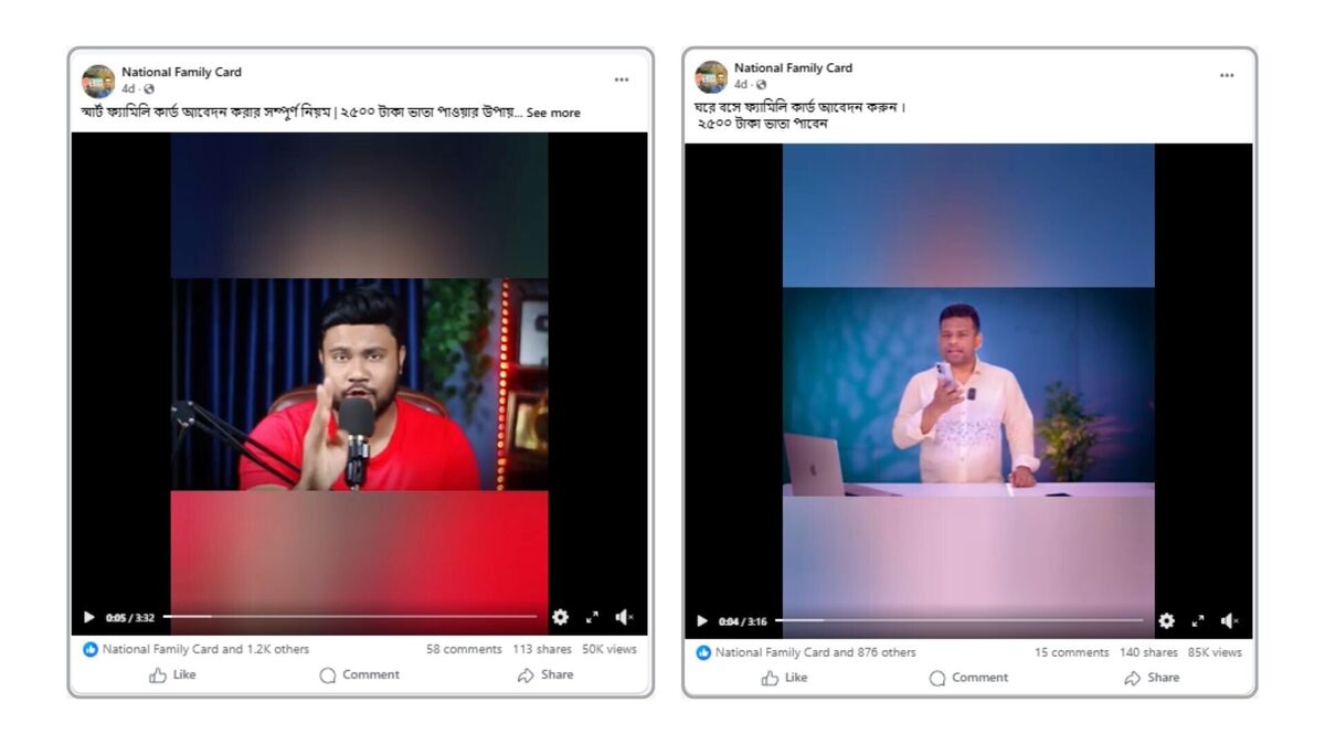 এছাড়া ‘Family Card BD’ পেইজ থেকে ৯ মার্চ করা একটি ভিডিওতে “ফ্যামিলি কার্ড আবেদন করুন ঘরে বসেই মাত্র ২ মিনিটেই” ক্যাপশন ব্যবহার করা হয়। ভিডিওটির শুরুতে ATN News-এর একটি সংবাদ প্রতিবেদন থেকে খণ্ডিত অংশ যুক্ত করা হয়। এরপর ভুয়া আবেদন প্রক্রিয়া দেখিয়ে ২৫০ টাকা আবেদন ফির কথা উল্লেখ করা। ভিডিওটি ৭৫ হাজারের বেশি বার দেখা হয়েছে। পেইজটিতে একই ধরনের আরও দুটি ভিডিও পাওয়া যায়।