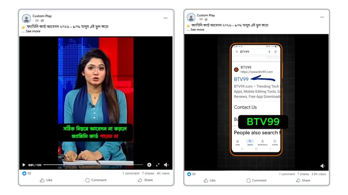 Custom Play নামের একটি পেইজ ৯ মার্চ “ফ্যামিলি কার্ড আবেদন ২০২৬ – ৯০% মানুষ এই ভুল করে!” ক্যাপশন ব্যবহার করে একটি ভিডিও পোস্ট করে। ভিডিওটির শুরুতে যমুনা টিভি–র একটি সংবাদ ভিডিওর খণ্ডিত অংশ ব্যবহার করা হয়। পরে আবেদনের জন্য btv99.com নামের একটি ওয়েবসাইটে যেতে বলা হয়, যা আসলে একটি জুয়ার সাইট।
