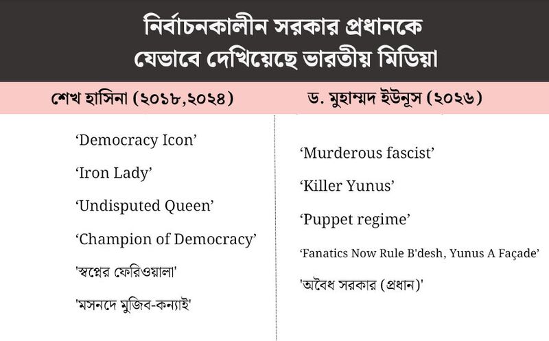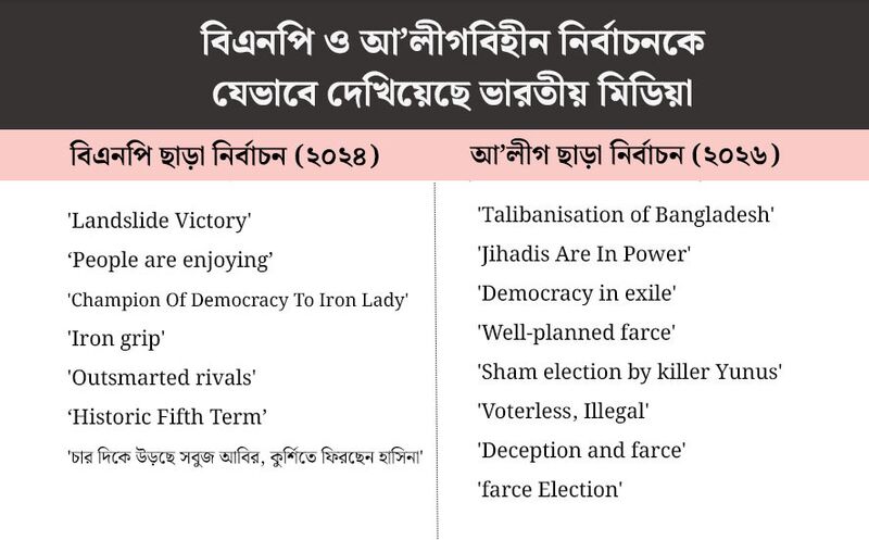 পূর্ববর্তী দুই নির্বাচনের সম্পূর্ণ বিপরীতে, ২০২৬ সালের নির্বাচনে এসে তাদের ফ্রেমিং মৌলিকভাবে বদলে যায়। এবার আওয়ামী লীগের অনুপস্থিতিকে কেন্দ্র করে তারা পুরো নির্বাচনকে সরাসরি 'প্রহসন', 'অবৈধ', সংখ্যালঘু নির্যাতন ও ভারতের নিরাপত্তার জন্য চরম হুমকির ফ্রেমে তুলে ধরে।
