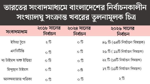 এই প্রতিবেদনে বাংলাদেশের তিনটি জাতীয় নির্বাচন— ২০১৮, ২০২৪ এবং সদ্য অনুষ্ঠিত ২০২৬-কে ঘিরে ভারতীয় সংবাদমাধ্যমগুলোর কাভারেজ তুলনামূলকভাবে বিশ্লেষণ করা হয়েছে।