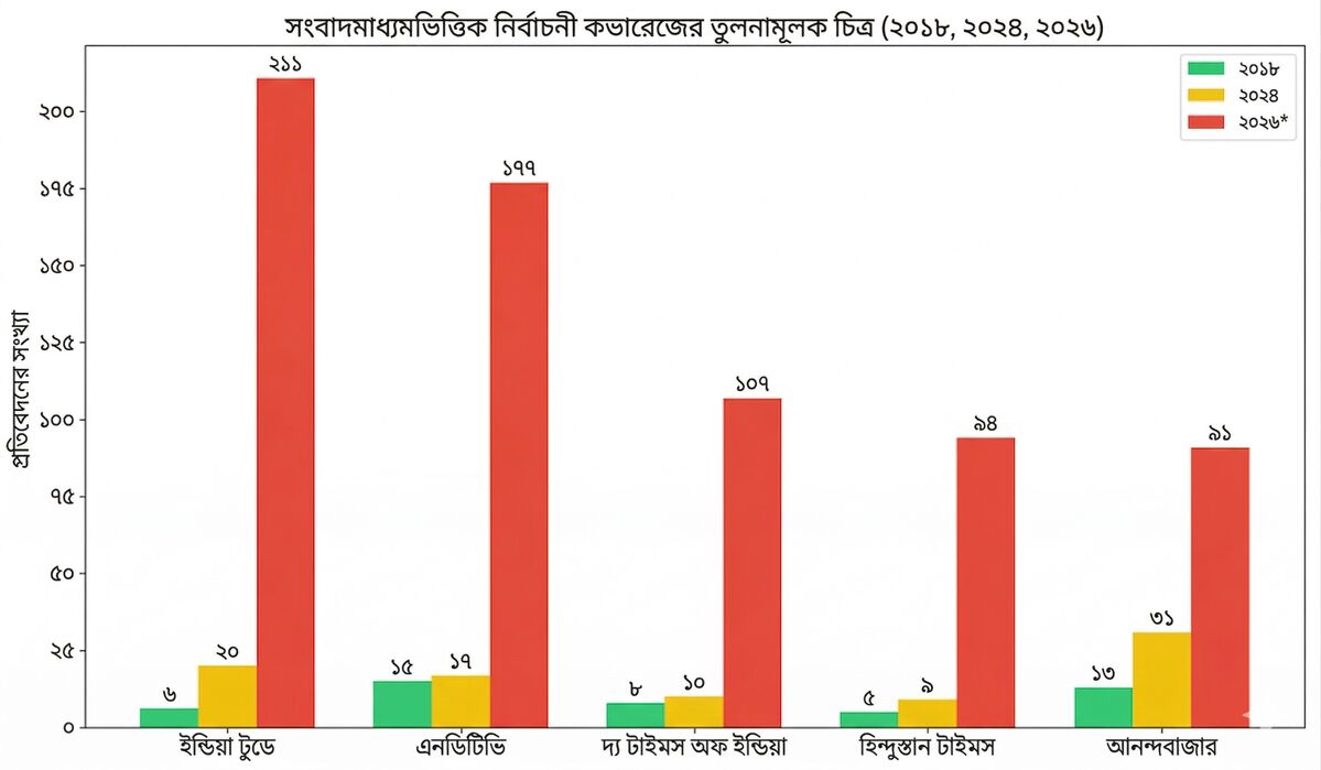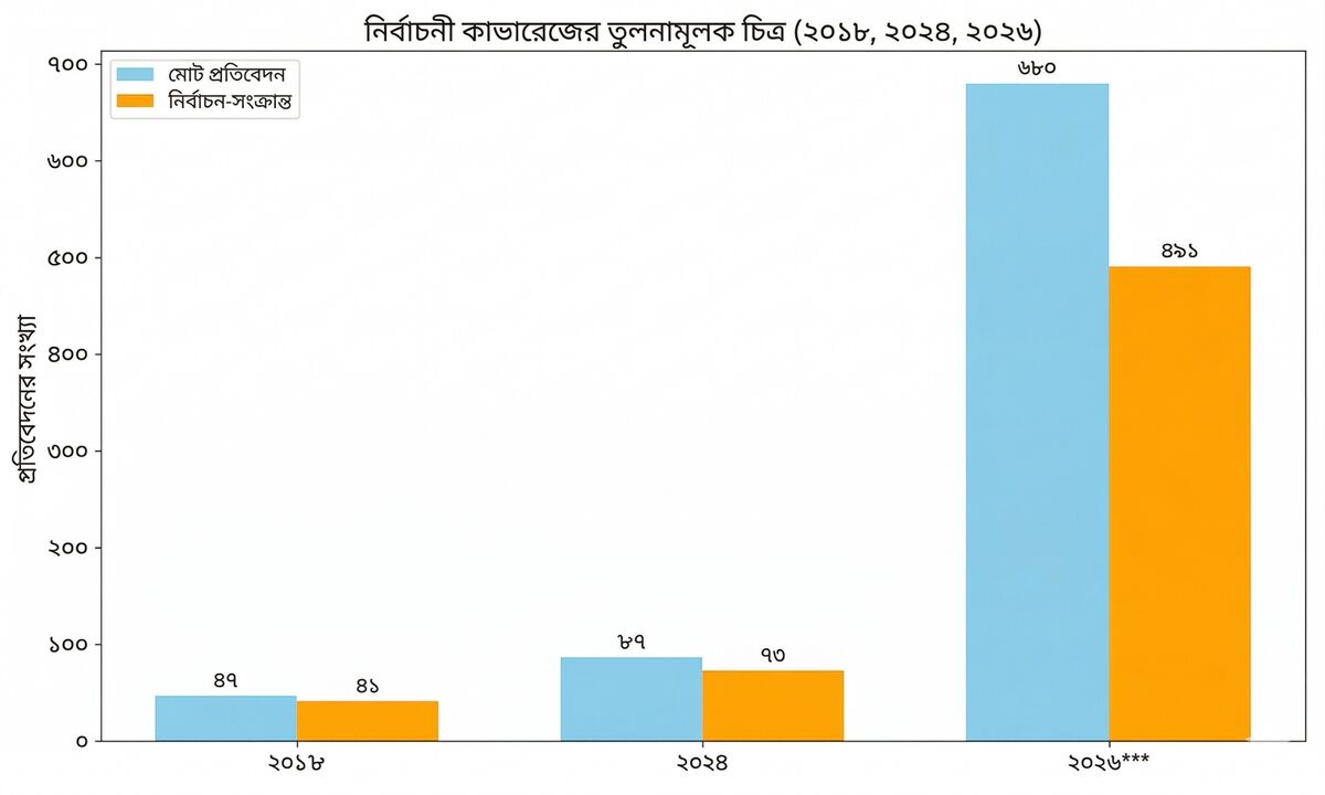 মিডিয়াভিত্তিক বিশ্লেষণেও একই প্রবণতা দেখা যায়। ২০২৬ সালের নির্বাচনী পর্বে প্রায় সব সংবাদমাধ্যমেই প্রতিবেদনের সংখ্যা আগের দুই নির্বাচনের তুলনায় অস্বাভাবিকভাবে বেড়েছে।
