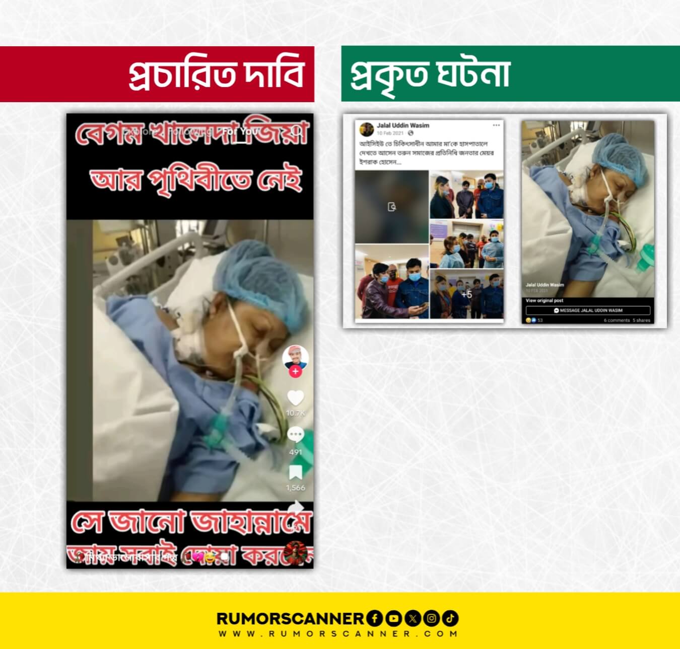 উল্লেখ্য, ছবিটি ব্যবহার করে ২০২১ সালে একই ধরণে দাবি প্রচার করা হলে তখন রিউমর স্ক্যানার এ বিষয়ে ‘হাসপাতালে চিকিৎসাধীন খালেদা জিয়ার ছবি নয় এটি’ শিরোনামে ফ্যাক্টচেক প্রতিবেদন প্রকাশ করে। অর্থাৎ, আলোচিত দাবিতে ব্যবহৃত ছবির ব্যক্তি খালেদা জিয়া নন।
