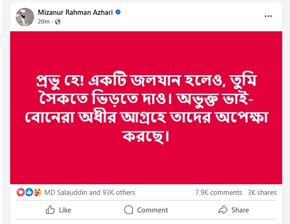 বৃহস্পতিবার (২ অক্টোবর) দুপুর দেড়টায় নিজের ভেরিফায়েড ফেসবুক পেজে পোস্ট দিয়ে তিনি লিখেছেন, ‘প্রভু হে! একটি জলযান হলেও, তুমি সৈকতে ভিড়তে দাও। অভুক্ত ভাই-বোনেরা অধীর আগ্রহে তাদের অপেক্ষা করছে।’