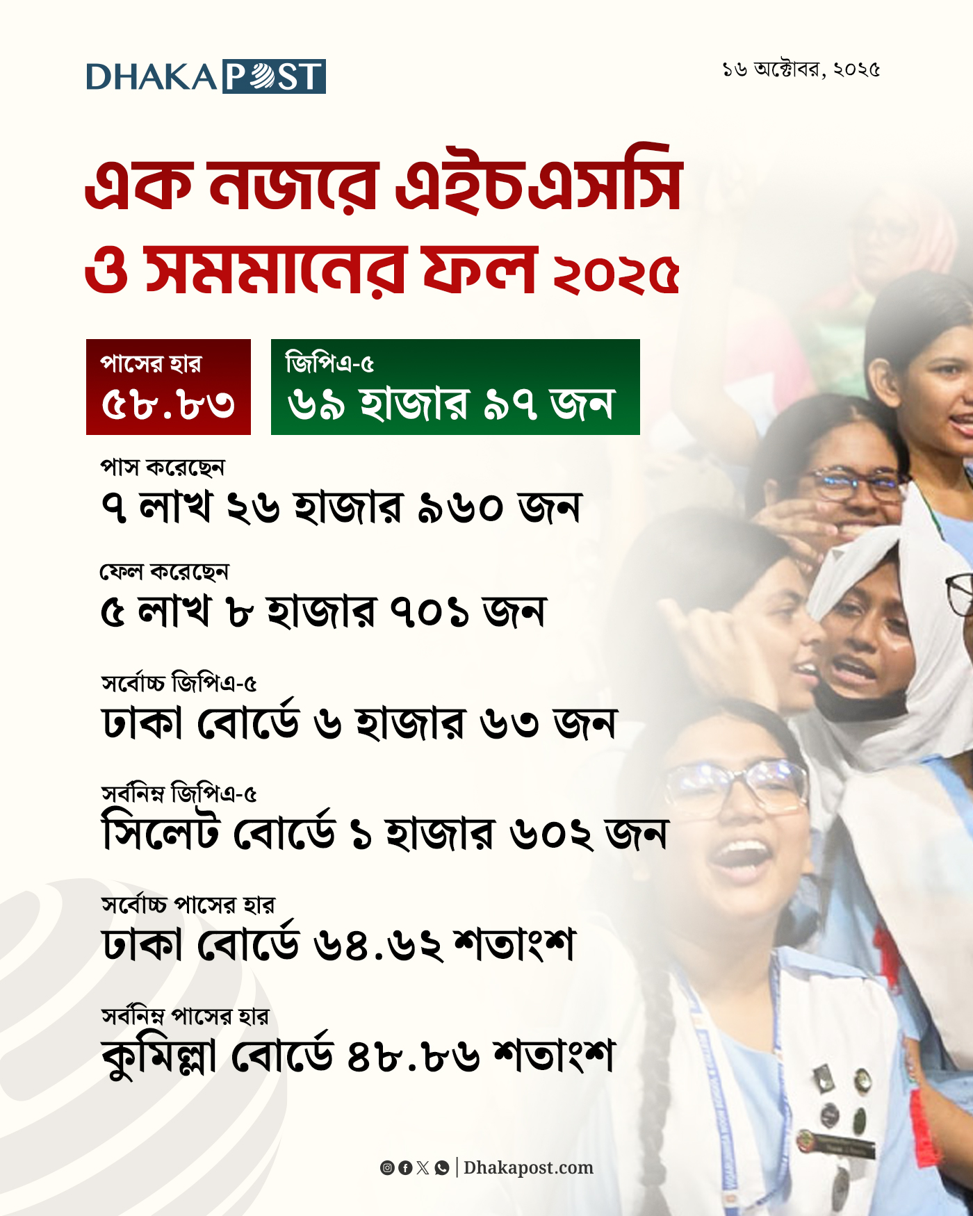 আর কোভিড-১৯ মহামারির বছরে (২০২০) সরাসরি পরীক্ষা না হওয়ায় সবাই ‘বিশেষ প্রক্রিয়ায়’ উত্তীর্ণ হয়। পরের দুই বছর (২০২১ ও ২০২২) পাসের হার ছিল যথাক্রমে ৮৪ ও ৯৫ শতাংশের বেশি। তবে ২০২৩ সালে তা নেমে আসে ৮০ শতাংশের নিচে।