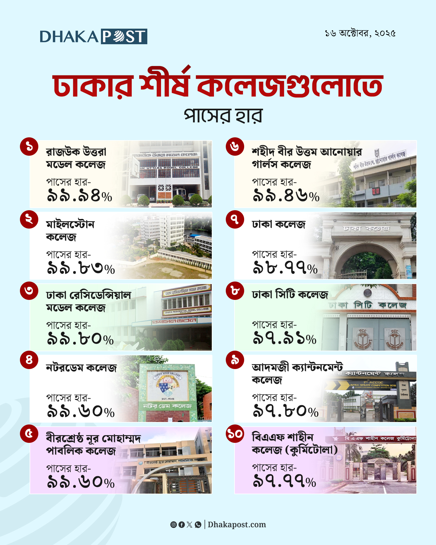 ঢাকা বোর্ডে এবার পাসের হার ৬৪ দশমিক ৬২ শতাংশ। আর কুমিল্লায় ৪৮ দশমিক ৮৬ শতাংশ। এ ছাড়া রাজশাহী বোর্ডে পাসের হার ৫৯.৪০ শতাংশ, যশোর বোর্ডে পাসের হার ৫০.২০ শতাংশ, চট্টগ্রাম বোর্ডে পাসের হার ৫২.৫৭ শতাংশ, বরিশাল বোর্ডে পাসের হার ৬২.৫৭ শতাংশ, সিলেট বোর্ডে পাসের হার ৫১.৮৬ শতাংশ, দিনাজপুর বোর্ডে পাসের হার ৫৭.৪৯ শতাংশ এবং ময়মনসিংহ বোর্ডে পাসের হার ৫১.৫৪ শতাংশ।