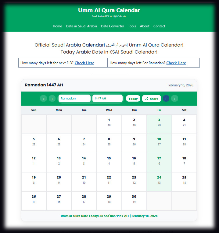 সৌদি আরবের তৈরি করা দাপ্তরিক হিজরি ক্যালেন্ডার উম্ম আল-কুরা অনুযায়ী আগামী বুধবার ১৮ ফেব্রুয়ারি রমজানের প্রথমদিন পড়বে। যদিও তাদের প্রতিবেশী দেশ সংযুক্ত আরব আমিরাতের একাধিক জ্যোতির্বিদ্যা সংস্থা জানিয়েছে, আগামীকাল মঙ্গলবার মধ্যপ্রাচ্যের কোথাও চাঁদ দেখা যাবে না।