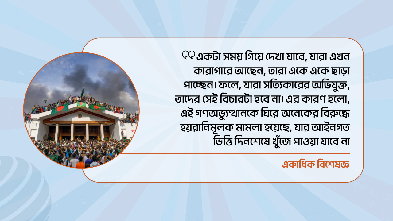 তবে, মানবতাবিরোধী অপরাধের দায়ে হওয়া এই মামলাগুলো হয়তো প্রত্যাহার বা মীমাংসা হতে সময় লাগতে পারে, কিন্তু বিচারকাজে সহনশীল আকার ধারণ করবে। একটা সময় গিয়ে দেখা যাবে, যারা এখন কারাগারে আছেন, তারা একে একে ছাড়া পাচ্ছেন। ফলে, যারা সত্যিকারের অভিযুক্ত, তাদের সেই বিচারটা হবে না। এর কারণ হলো, এই গণঅভ্যুত্থানকে ঘিরে অনেকের বিরুদ্ধেই হয়রানিমূলক মামলাও হয়েছে, যার আইনগত ভিত্তি দিনশেষে খুঁজে পাওয়া যাবে না।