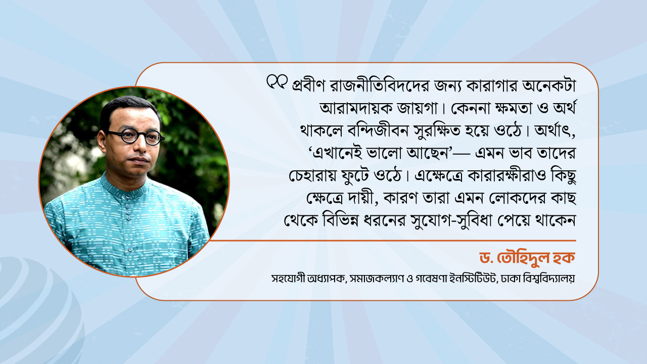 এই অপরাধ বিশেষজ্ঞ আরও বলেন, প্রবীণ রাজনীতিবিদদের জন্য কারাগার অনেকটা আরামদায়ক। কেননা ক্ষমতা ও অর্থ থাকলে বন্দিজীবন সুরক্ষিত হয়ে ওঠে। অর্থাৎ, ‘এখানেই ভালো আছেন’— এমন ভাব তাদের চেহারায় ফুটে ওঠে। এক্ষেত্রে কারারক্ষীরাও কিছু ক্ষেত্রে দায়ী, কারণ তারা এমন লোকদের কাছ থেকে বিভিন্ন ধরনের সুযোগ-সুবিধা পেয়ে থাকেন। আর এই চর্চা বহু আগ থেকেই রয়েছে।