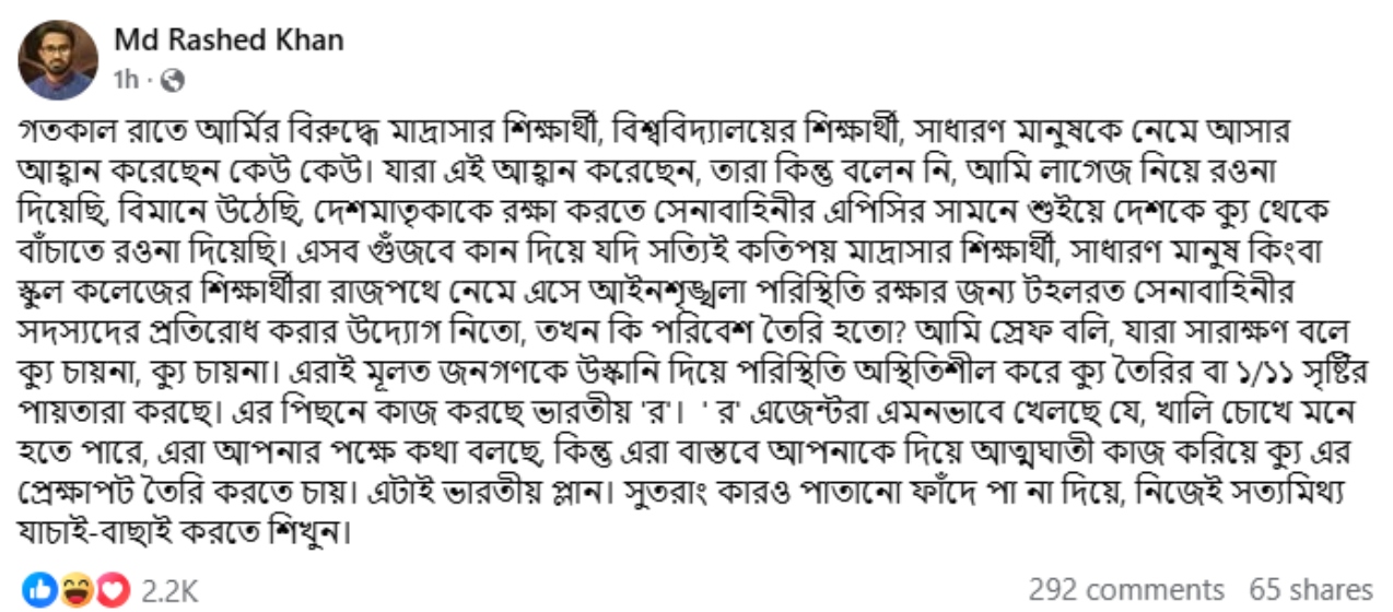 রোববার (১২ অক্টোবর) বেলা ১১টার দিকে দেওয়া ওই ফেসবুক পোস্টে রাশেদ খান লিখেছেন, গতকাল রাতে আর্মির বিরুদ্ধে মাদ্রাসার শিক্ষার্থী, বিশ্ববিদ্যালয়ের শিক্ষার্থী ও সাধারণ মানুষকে নেমে আসার আহ্বান করেছেন কেউ কেউ। যারা এই আহ্বান করেছেন, তারা কিন্তু বলেননি, আমি লাগেজ নিয়ে রওনা দিয়েছি, বিমানে উঠেছি, দেশমাতৃকাকে রক্ষা করতে সেনাবাহিনীর এপিসির সামনে শুয়ে দেশকে ক্যু থেকে বাঁচাতে রওনা দিয়েছি।