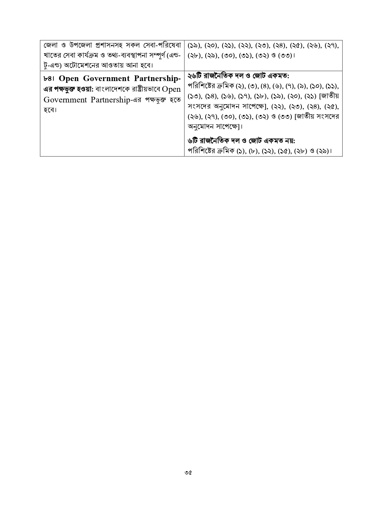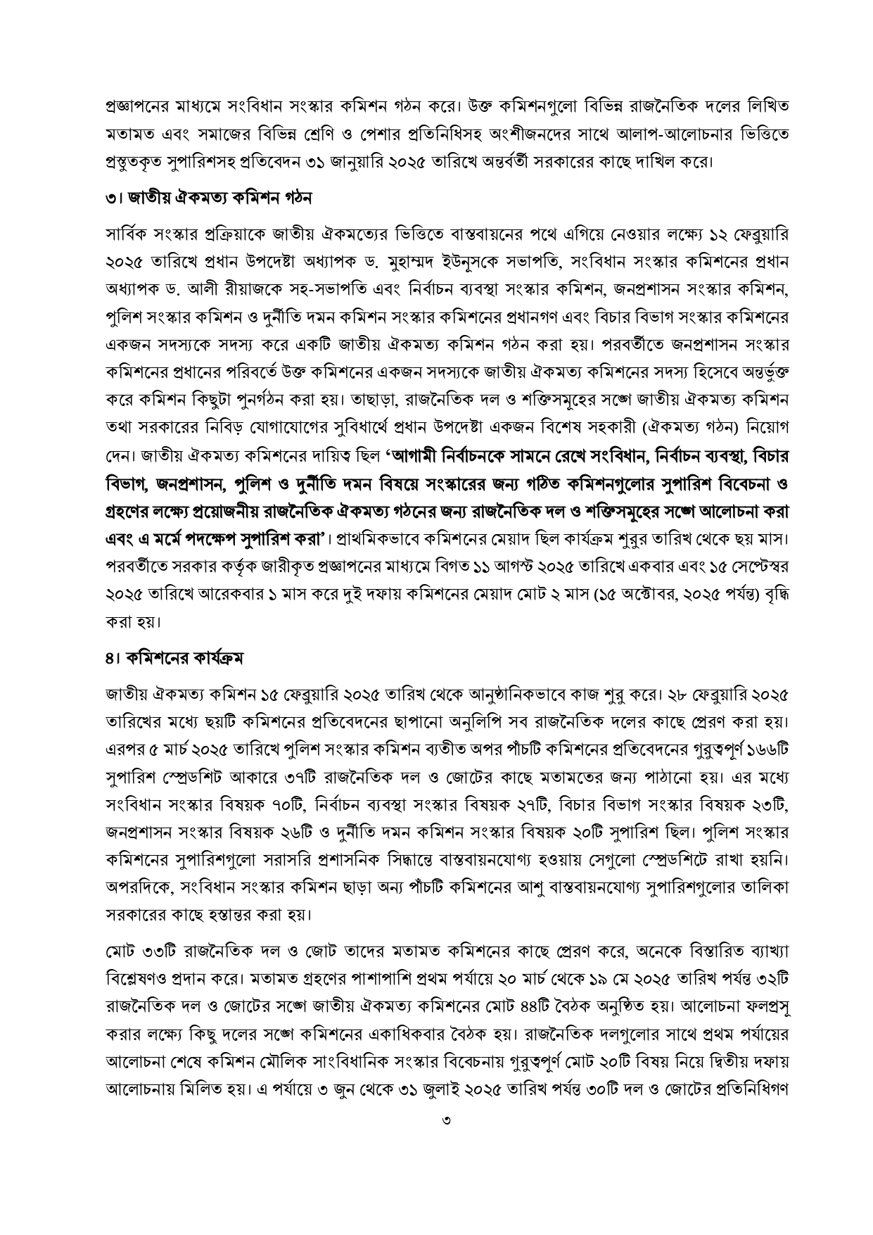 জাতীয় ঐকমত্য কমিশনের উদ্যোগে বিভিন্ন রাজনৈতিক দল, জোট ও শক্তিসমূহের পারস্পরিক ও সম্মিলিত আলোচনার মাধ্যমে রাষ্ট্রের সংবিধান, নির্বাচন, বিচার বিভাগ, জনপ্রশাসন, পুলিশ প্রশাসন ও দুর্নীতি দমন ব্যবস্থা সংস্কারের লক্ষ্যে বিভিন্ন বিষয়ে ঐকমত্যে পৌঁছেছে।