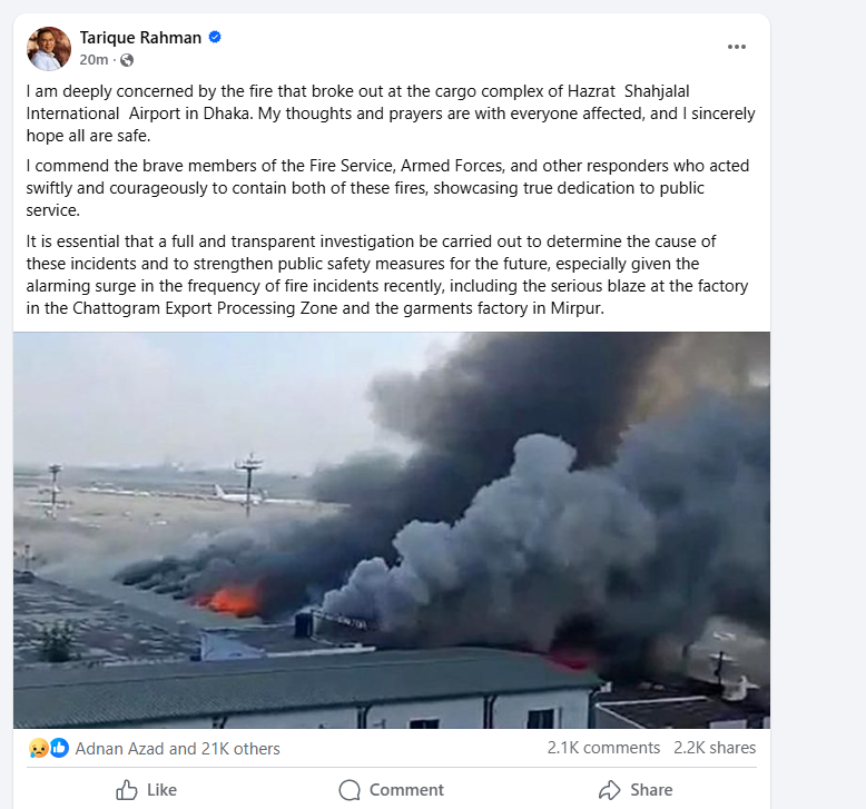 শনিবার সামাজিক যোগাযোগমাধ্যম ফেসবুকে দেওয়া এক পোস্টে তিনি লেখেন, ‘ঢাকার হযরত শাহজালাল আন্তর্জাতিক বিমানবন্দরের কার্গো কমপ্লেক্সে ভয়াবহ অগ্নিকাণ্ডে আমি গভীরভাবে উদ্বিগ্ন। ক্ষতিগ্রস্ত সবাইকে আমার চিন্তা ও প্রার্থনায় রেখেছি। আশা করি সবাই নিরাপদে আছেন।’