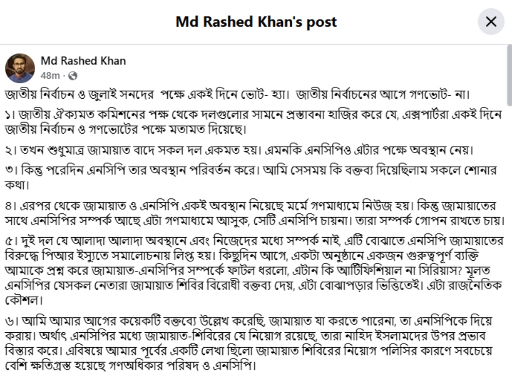 বৃহস্পতিবার (৩০ অক্টোবর) নিজের ফেসবুক অ্যাকাউন্টে দেওয়া এক স্ট্যাটাসে রাশেদ খান লিখেছেন, জাতীয় নির্বাচন ও জুলাই সনদের পক্ষে একই দিনে ভোট—হ্যাঁ। জাতীয় নির্বাচনের আগে গণভোট—না।