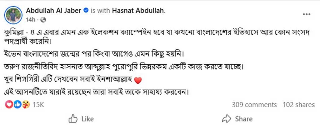 মুখ্য সংগঠক হাসনাত আব্দুল্লাহ কুমিল্লা-৪ দেবীদ্বার উপজেলায় নির্বাচনের জন্য প্রচার চালাচ্ছেন। গত কয়েক মাস ধরে এলাকায় উঠান বৈঠক ও উন্নয়নমূলক কাজে যুক্ত হয়ে কথা বলতে দেখা যাচ্ছে হাসনাতকে।