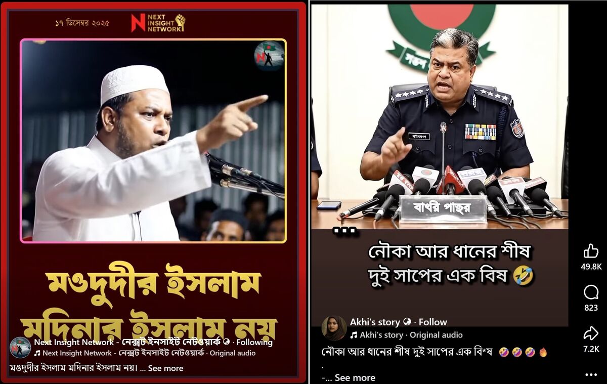 যেমন, “Next Insight Network - নেক্সট ইনসাইট নেটওয়ার্ক” নামক একটি পেইজ থেকে একটি ভিডিও পোস্ট করা হয়েছে যেখানে দেখা যাচ্ছে, দাঁড়ি-টুপি-পাঞ্জাবি পরা এক মধ্যবয়স্ক আলেম স্টেজে দাঁড়ি জনতার উদ্দেশ্যে বলছেন, “মওদুদীর ইসলাম মদিনার ইসলাম নয়। তোমরা এই মাটিতে অনেক ধোঁকাবাজি করছো, এইবার করতে আসলে তোমাদের ঠাঁই নাই। একাত্তরের মতো আবারও জামায়াতকে না করার সময় এসেছে। সবাই জামায়াতকে না বলুন।”