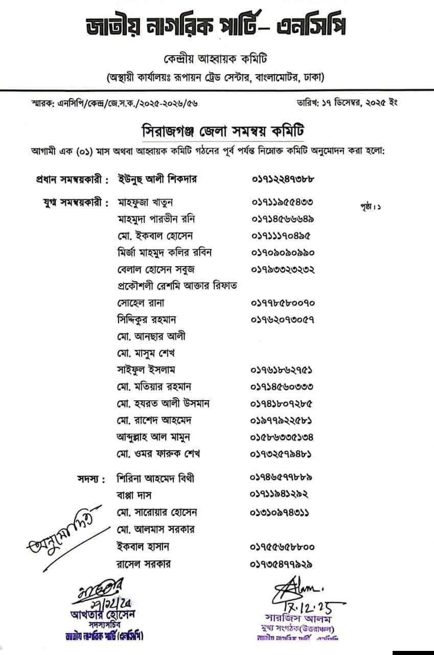 উল্লেখ্য, বৃহস্পতিবার দিবাগত রাতে দলের সদস্য সচিব আখতার হোসেন এবং মুখ্য সংগঠক (উত্তরাঞ্চল) সারজিস আলম স্বাক্ষরিত বিজ্ঞপ্তিতে সিরাজগঞ্জ জেলা সমন্বয় কমিটি অনুমোদন করা হয়