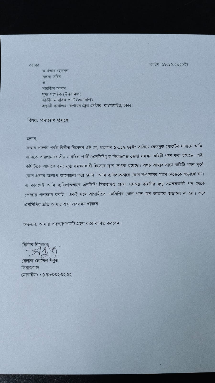 পদত্যাগপত্রে তিনি উল্লেখ করেন, ‘আমি বেলাল হোসেন সবুজ সিরাজগঞ্জে বৈষম্যবিরোধী ছাত্র আন্দোলনে নেতৃত্ব দিয়েছি। সম্প্রতি সময়ে এনসিপির কেন্দ্রীয় নেতৃবৃন্দ যখনই সিরাজগঞ্জ আসতেন, তখনই আমাকে ডাকতেন। আমি ব্যবসার পাশাপাশি তাদের সঙ্গে সময় দিতাম। তাদের কর্মকাণ্ডে বেকআপ দিতাম।