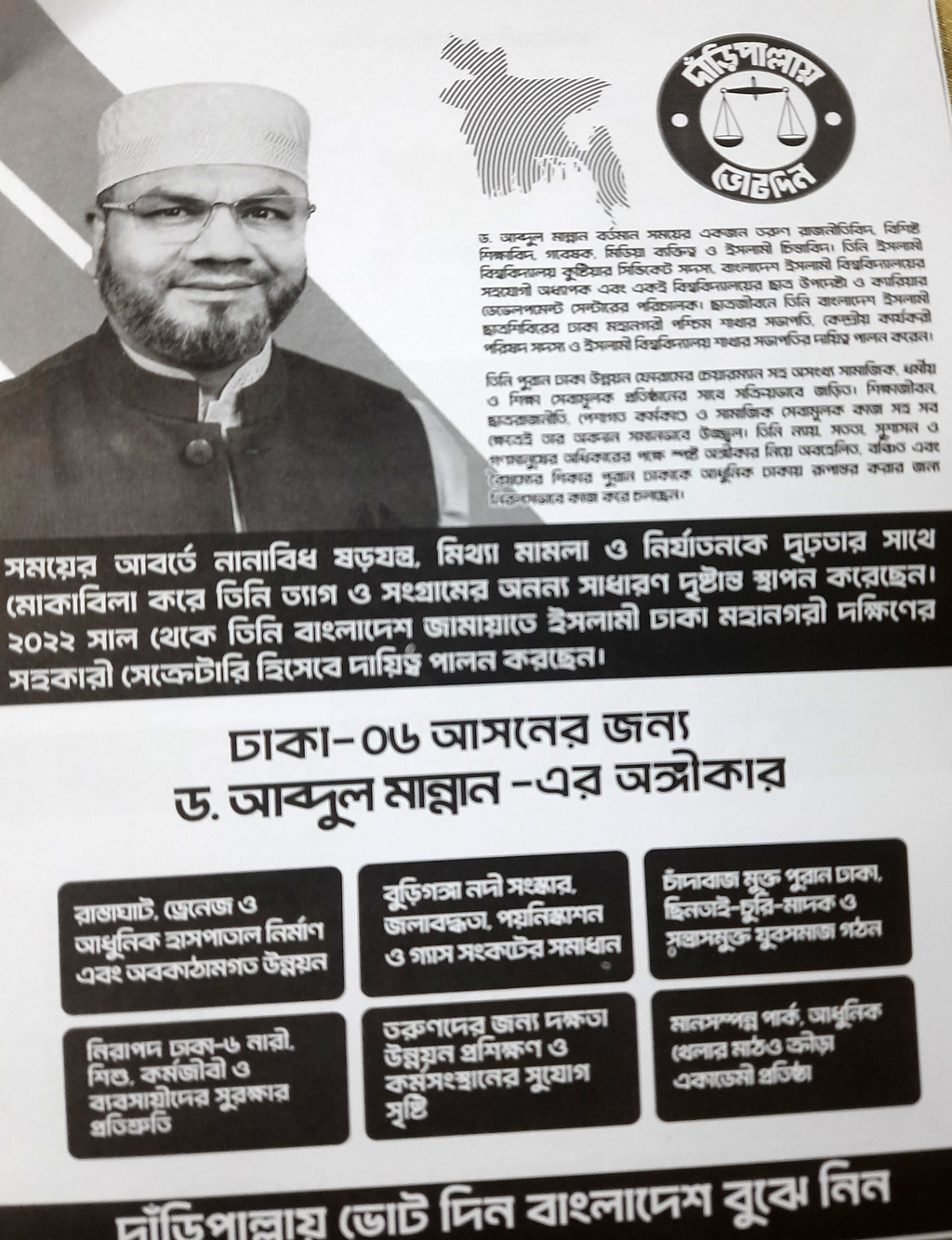 অন্যদিকে দাঁড়িপাল্লার প্রার্থী মান্নান জামায়াতের ঘরোয়া রাজনীতিতে পরিচিত হলেও ভোটের রাজনীতিতে নতুন। ছাত্রজীবনে তিনি ছিলেন বাংলাদেশ ইসলামী ছাত্রশিবিরের ঢাকা মহানগরী পশ্চিম শাখা ও কুষ্টিয়ার ইসলামী বিশ্ববিদ্যালয় শাখার সভাপতি।