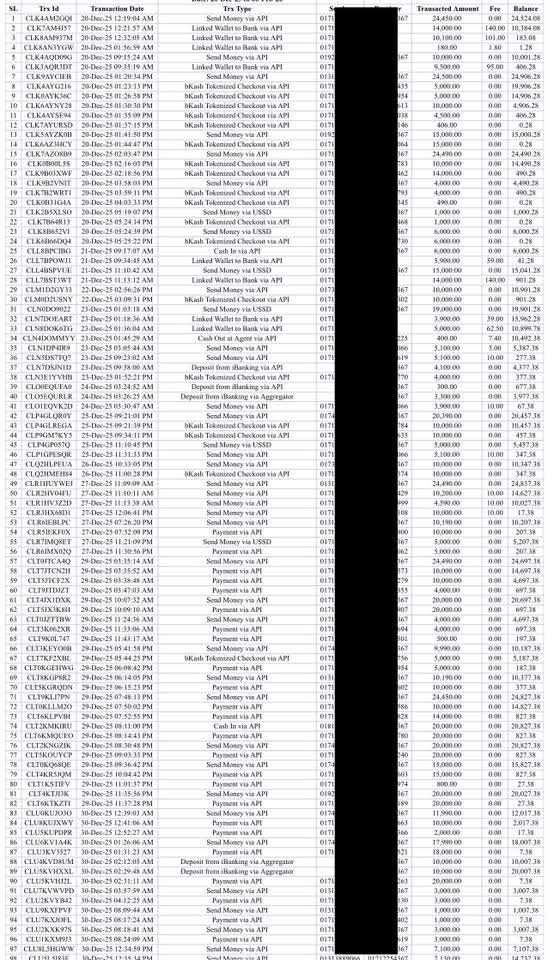 আবার ‘লন্ড্রি পিকআপ অ্যান্ড ড্রপ’ নামে নিবন্ধিত একটি নম্বর থেকে এসেছে ৬ লাখ ৩৪ হাজার ৯১০ টাকা এবং মিজানুর নামে আরেক ব্যক্তির নম্বর থেকে ৫ লাখ ৪৯ হাজার ১২০ টাকা। পাশাপাশি তাঁর ব্যক্তিগত ব্যাংক অ্যাকাউন্টেও উল্লেখযোগ্য অঙ্কের লেনদেনের তথ্য পাওয়া গেছে।