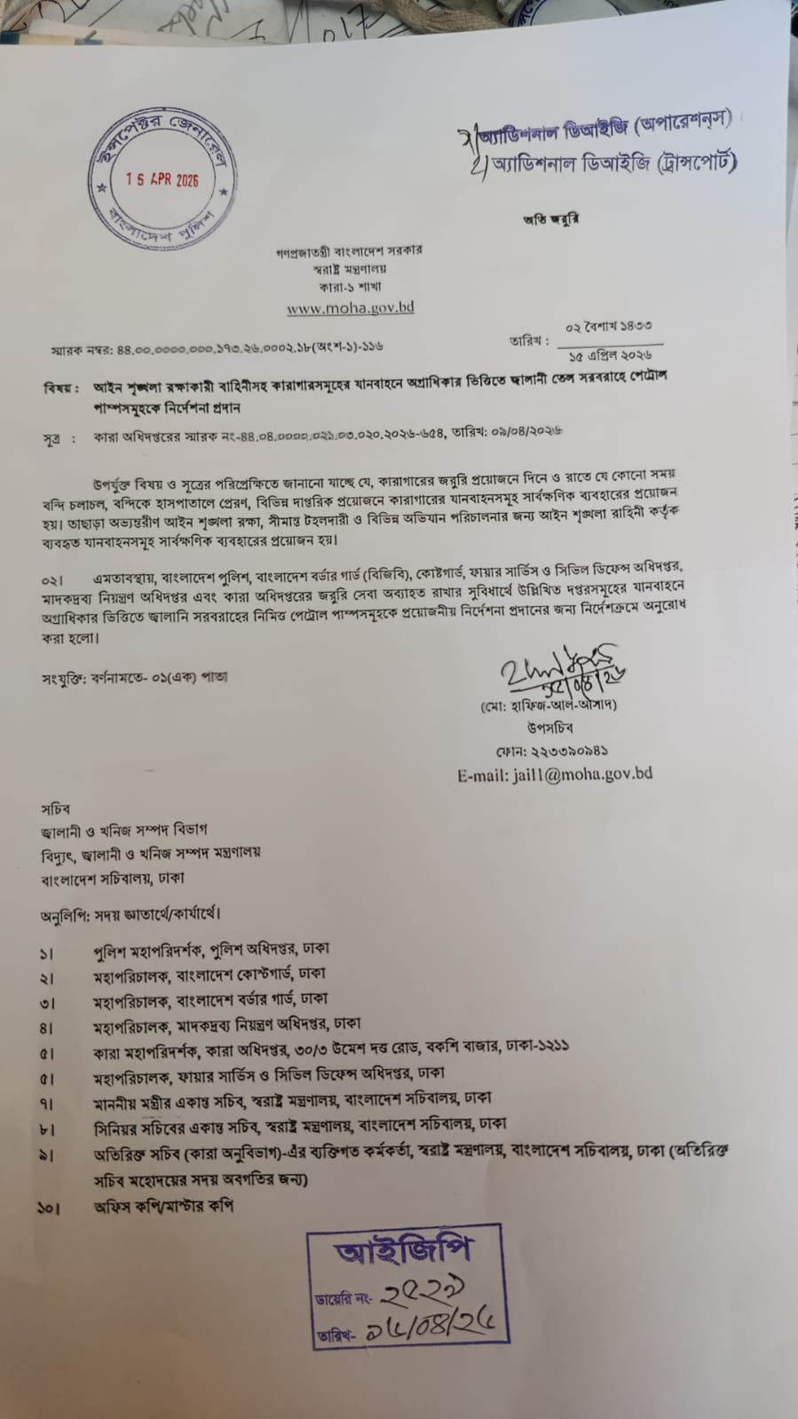 স্বরাষ্ট্র মন্ত্রণালয়ের উপসচিব মো. হাফিজ-আল-আসাদ স্বাক্ষরে গত ১৫ এপ্রিল এ নির্দেশনা দেওয়া হয়। শনিবার (১৮ এপ্রিল) মন্ত্রণালয় এ তথ্য নিশ্চিত করেছে।
