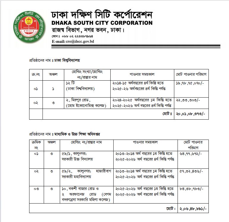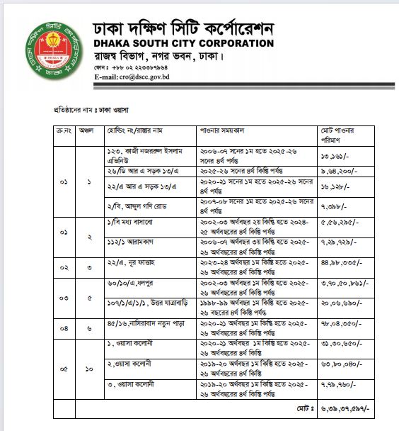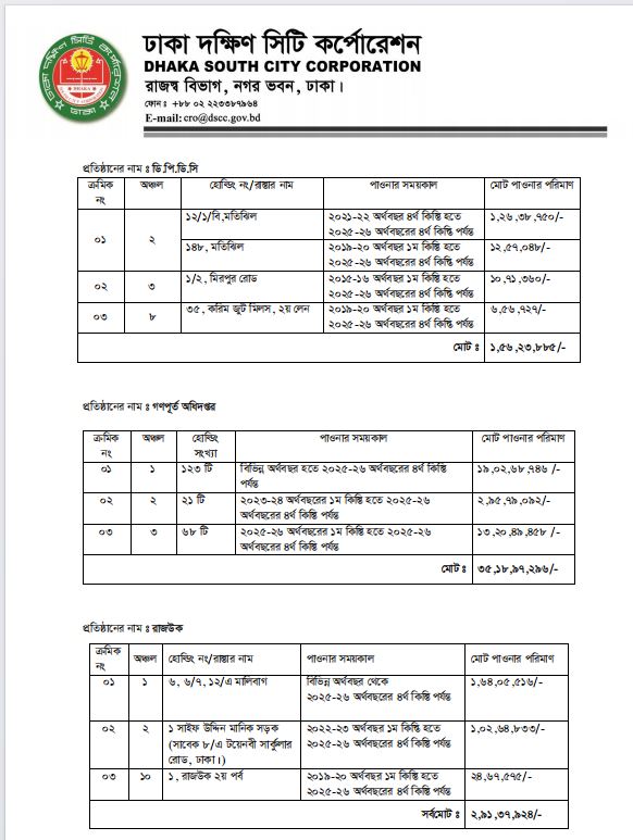 সরকারের ২৩টি শীর্ষ প্রতিষ্ঠানের কাছে প্রায় ১৩৮ কোটি টাকার বেশি রাজস্ব বকেয়া রয়েছে ঢাকা দক্ষিণ সিটি করপোরেশনের (ডিএসসিসি)। যা বছরের পর বছর ধরে আদায়ে ব্যর্থ হচ্ছে ডিএসসিসি। চ্যানেল 24 অনুসন্ধানে উঠে এসেছে সেসব প্রতিষ্ঠানের নাম। এছাড়া বেসরকারি প্রতিষ্ঠানের কাছেও পাওনা আছে ৭০ কোটি টাকা।
