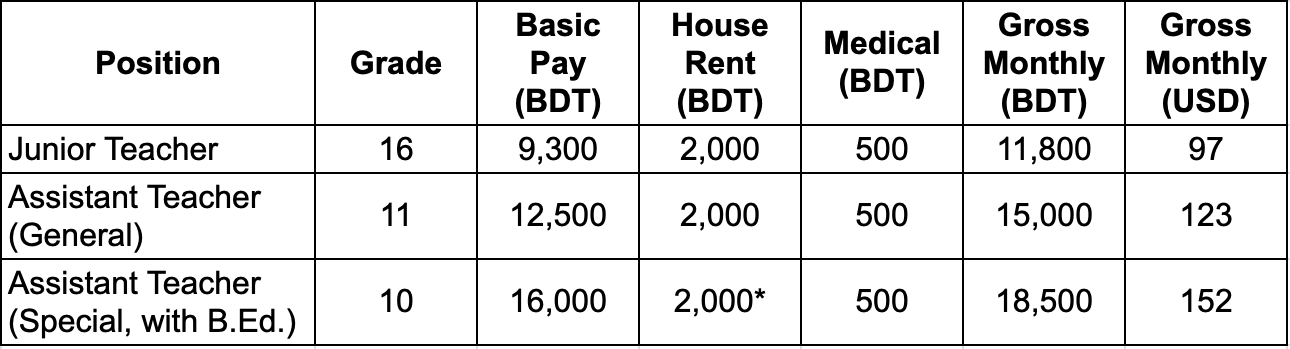 বর্তমানে দেশে ২০১৫ সালের জাতীয় বেতন স্কেল কার্যকর রয়েছে, যার সাথে ২০২৫ সালের ১ নভেম্বর থেকে সামান্য ভাতা সমন্বয় করা হয়েছে। এ স্কেলের আওতায় স্কুল-২ পর্যায়ের জুনিয়র শিক্ষকদের কর্মজীবন শুরু হয় ১৬তম গ্রেডে ৯ হাজার ৩০০ টাকা মূল বেতন দিয়ে। ন্যূনতম ২ হাজার টাকা বাড়িভাড়া ভাতা ও ৫০০ টাকা চিকিৎসা ভাতা যোগ করে তাদের মোট বেতন হয় ১১ হাজার ৮০০ টাকা, যা মাত্র ৯৭ ডলারের সমান।