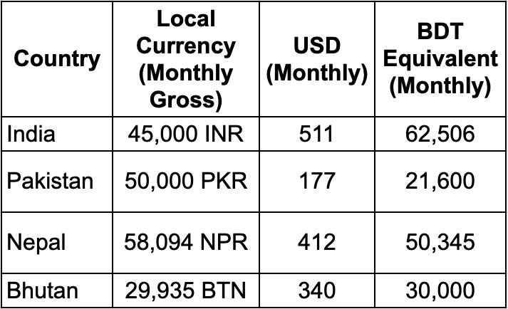 প্রতিবেশী দেশগুলোর তুলনায় বাংলাদেশ শিক্ষকদের বেতন প্রদানে সবচেয়ে পিছিয়ে। ভারত, পাকিস্তান, নেপাল ও ভুটানে শিক্ষক পেশাকে মধ্যবিত্ত মর্যাদার পেশা হিসেবে বিবেচনা করা হয় এবং সেখানে শুরুতেই উচ্চ বেতন নিশ্চিত করা হয়। অথচ বাংলাদেশে শিক্ষকরা অনেক ক্ষেত্রেই দাপ্তরিক সহকারীদের নিচে অবস্থান করেন। ক্রয়ক্ষমতা সমতা (পিপিপি) বিবেচনায় এই ব্যবধান আরও প্রকট।