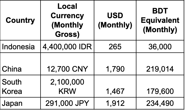 এশিয়ার অন্যান্য দেশেও বাংলাদেশের চেয়ে অনেক বেশি বেতন দেওয়া হয়। ইন্দোনেশিয়া ও চীন শিক্ষক সার্টিফিকেশন ও আবাসন সুবিধা প্রদান করে প্রকৃত আয় বাড়িয়ে থাকে। দক্ষিণ কোরিয়া ও জাপানের মতো দেশগুলোতে শিক্ষকতা উচ্চ মর্যাদা ও উচ্চ বেতনের পেশা, এটি শিক্ষার মানেও প্রভাব ফেলে।
