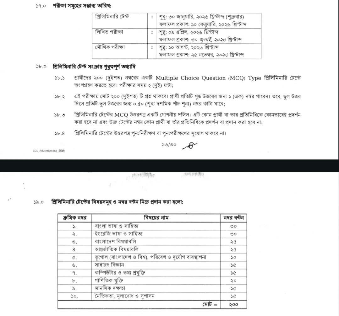 বিজ্ঞপ্তিতে জানানো হয়, ৫০তম বিসিএসের প্রিলিমিনারি পরীক্ষা ২০২৬ সালের ৩০ জানুয়ারি অনুষ্ঠিত হবে। এছাড়া লিখিত পরীক্ষার শুরুর তারিখ ৯ এপ্রিল ও মৌখিক পরীক্ষা ১০ আগস্ট শুরু হবে।