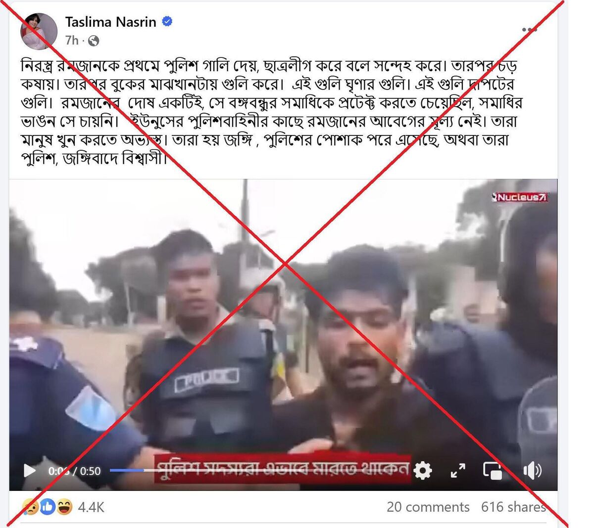 তসলিমা নাসরিন তাঁর প্রোফাইল থেকে একটি ভিডিও পোস্ট করেছেন। ওই ভিডিওতে দেখা যাচ্ছে, কালো গেঞ্জি ও প্যান্ট পরিহিত এক তরুণকে পুলিশ ও এপিবিএন এর সদস্য আটক করে মারধর করছেন। ভিডিও আরেক অংশ দেখা যায়, একই রকম কালো গেঞ্জি ও প্যান্ট পরিহিত এক ব্যক্তির লাশ একটি ভ্যান গাড়িতে করে নিয়ে যাচ্ছেন তার স্বজনরা।