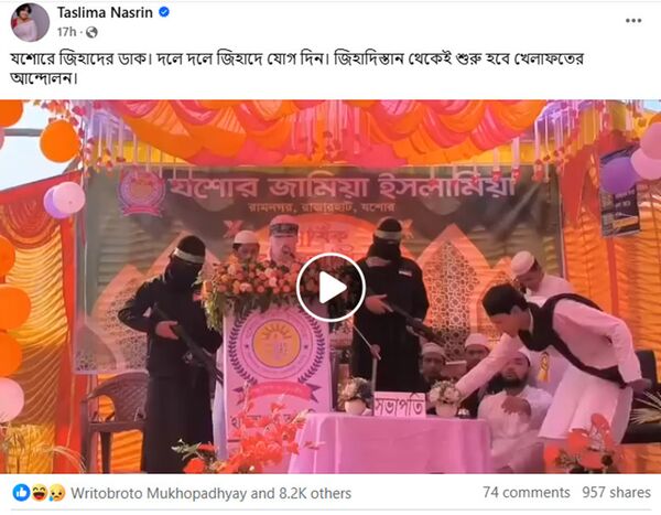 ২০২৪ সালের ডিসেম্বরে তসলিমা নাসরিন তার ফেসবুকে একটি ভিডিও শেয়ার করে দাবি করেন, “বাংলাদেশের যশোরে জিহাদের ডাক। দলে দলে জিহাদে যোগ দিন। জিহাদিস্তান থেকেই শুরু হবে খেলাফতের আন্দোলন।”