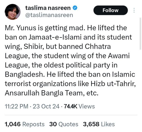 ফেসবুকে তসলিমা নাসরিনের পোস্ট দেখুন এখানে এবং এক্স এ পোস্ট দেখুন এখানে।