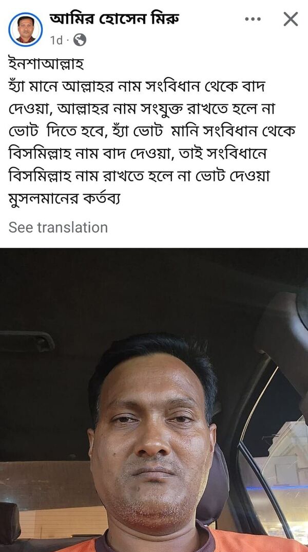 মাওলানা সালামতউল্লাহ মজু নামের একজন ফেসবুক পোস্টে লিখেছেন, “হ্যাঁ” ভোট দিলে নাকি সংবিধান থেকে বিসমিল্লাহ, আল্লাহর নাম ও রাষ্ট্রধর্ম ইসলাম বাদ দেয়া হবে। এই কথাটি গুজব নাকি সত্যি? দয়া করে আমাকে একটু জানান। আমি সত্যিটা জানতে চাই।”