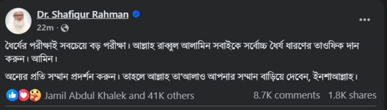 শুক্রবার সন্ধ্যা ৭টা ৪০ মিনিটে দেওয়া ডা. শফিকুর রহমানের এই রহস্যময় পোস্টটিতে মাত্র ৪১ মিনিটেই ৬৬ হাজার রিঅ্যাক্ট, ৯ হাজার কমেন্ট পড়ে এবং পোস্টটি প্রায় ৩ হাজার জন শেয়ার করেছেন।