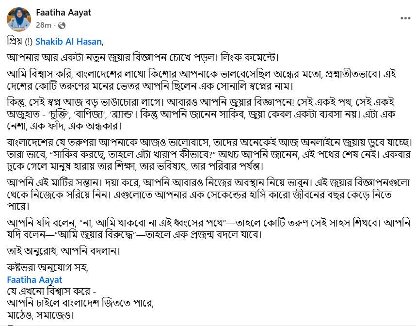 অনুরোধ জানিয়ে ফাতিহা আরও লেখেন, আপনি যদি বলেন, “না, আমি থাকবো না এই ধ্বংসের পথে”—তাহলে কোটি তরুণ সেই সাহস শিখবে। আপনি যদি বলেন—“আমি জুয়ার বিরুদ্ধে”—তাহলে এক প্রজন্ম বদলে যাবে। তাই অনুরোধ, আপনি বদলান। কষ্টভরা অনুযোগ সহ, ফাতিহা আয়াত, যে এখনো বিশ্বাস করে- আপনি চাইলে বাংলাদেশ জিততে পারে, মাঠেও, সমাজেও।