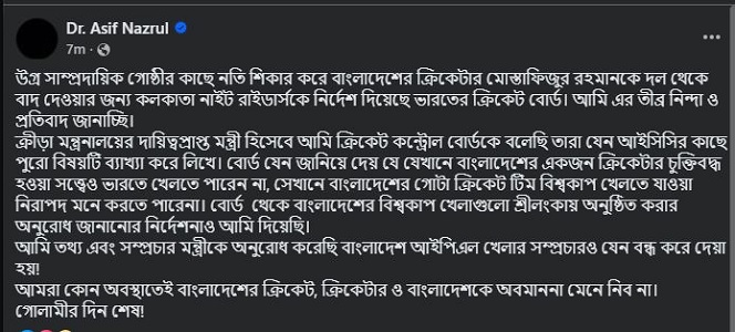 তিনি আরও লেখেন, ক্রীড়া মন্ত্রণালয়ের দায়িত্বপ্রাপ্ত মন্ত্রী হিসেবে আমি ক্রিকেট কন্ট্রোল বোর্ডকে বলেছি, তারা যেন আইসিসির কাছে পুরো বিষয়টি ব্যাখ্যা করে লেখে। বোর্ড যেন জানিয়ে দেয় যে, যেখানে বাংলাদেশের একজন ক্রিকেটার চুক্তিবদ্ধ হওয়া সত্ত্বেও ভারতে খেলতে পারেন না, সেখানে বাংলাদেশের গোটা ক্রিকেট টিম বিশ্বকাপ খেলতে যাওয়া নিরাপদ মনে করতে পারে না। বোর্ড থেকে বাংলাদেশের বিশ্বকাপের খেলাগুলো শ্রীলঙ্কায় অনুষ্ঠিত করার অনুরোধ জানানোর নির্দেশনাও আমি দিয়েছি।