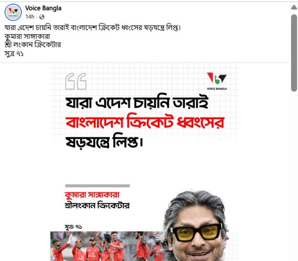 গতকাল (২৪ জানুয়ারি) সামাজিক যোগাযোগমাধ্যম ফেসবুকে Voice Bangla নামে একটি পেজ থেকে শ্রী লঙ্কার সাবেক ক্রিকেটার কুমার সাঙ্গাকারার নামে একটি ফটোকার্ড ছড়িয়ে পড়ে। ওই ফটোকার্ডে তাকে উদ্ধৃত করে লেখা হয়, “যারা এদেশ চায়নি তারাই বাংলাদেশ ক্রিকেট ধ্বংসের ষড়যন্ত্রে লিপ্ত।” প্রতিবেদন লেখা পর্যন্ত ফটোকার্ডসংবলিত পোস্টটি ২২৩ বার শেয়ার করা হয়েছে।
